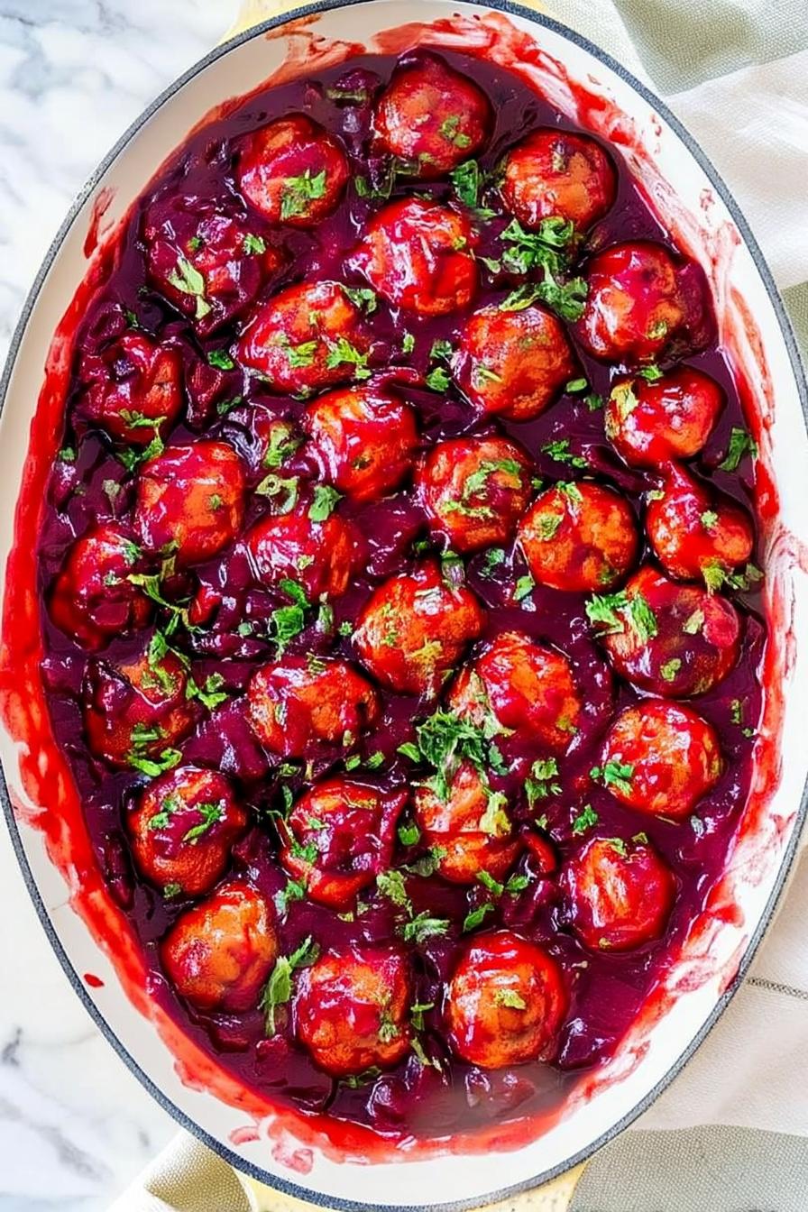 Tender meatballs baked and coated in a sweet-tart cranberry sauce, perfect for holiday gatherings and party bites.