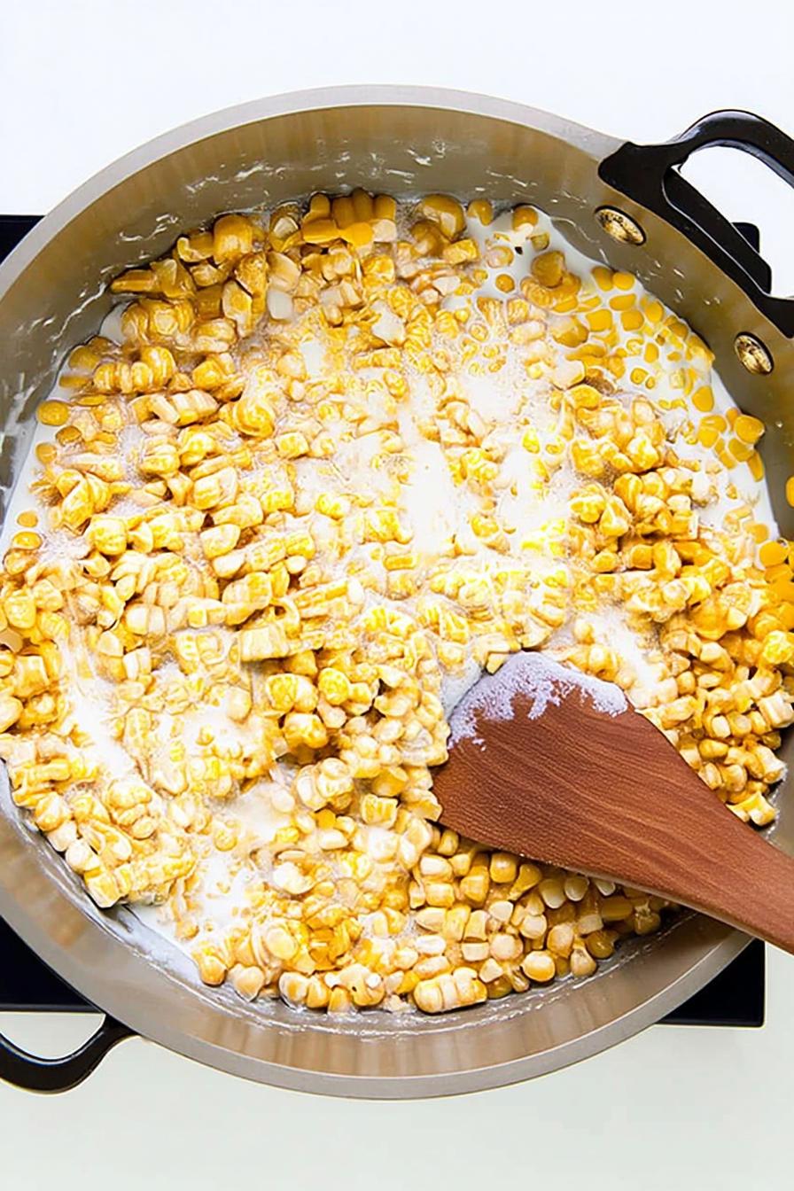 - Turn heat to low and nestle 4 oz cream cheese cubes into the corn. Stir gently until the mixture is silky smooth and slightly glossy, about 2–3 minutes.