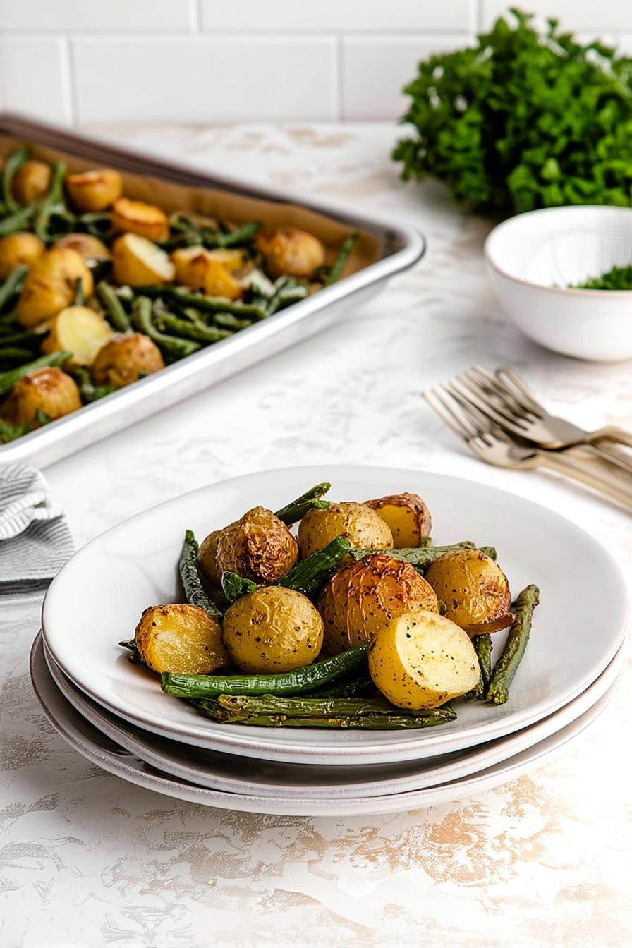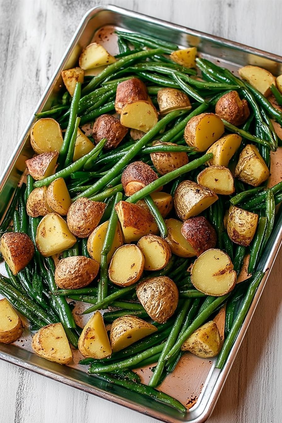 A simple sheet pan side dish featuring halved potatoes and trimmed green beans tossed with garlic powder, thyme, and olive oil, then roasted to golden edges and tender-crisp perfection.